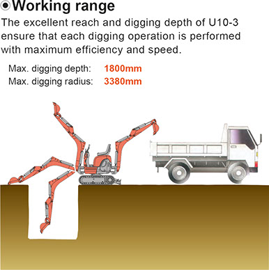 The excellent reach and digging depth of the U10-3 ensure that each digging operation is performed with maximum efficiency and speed.